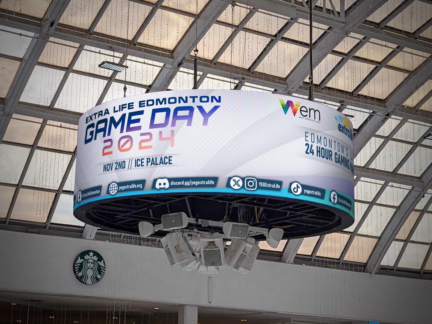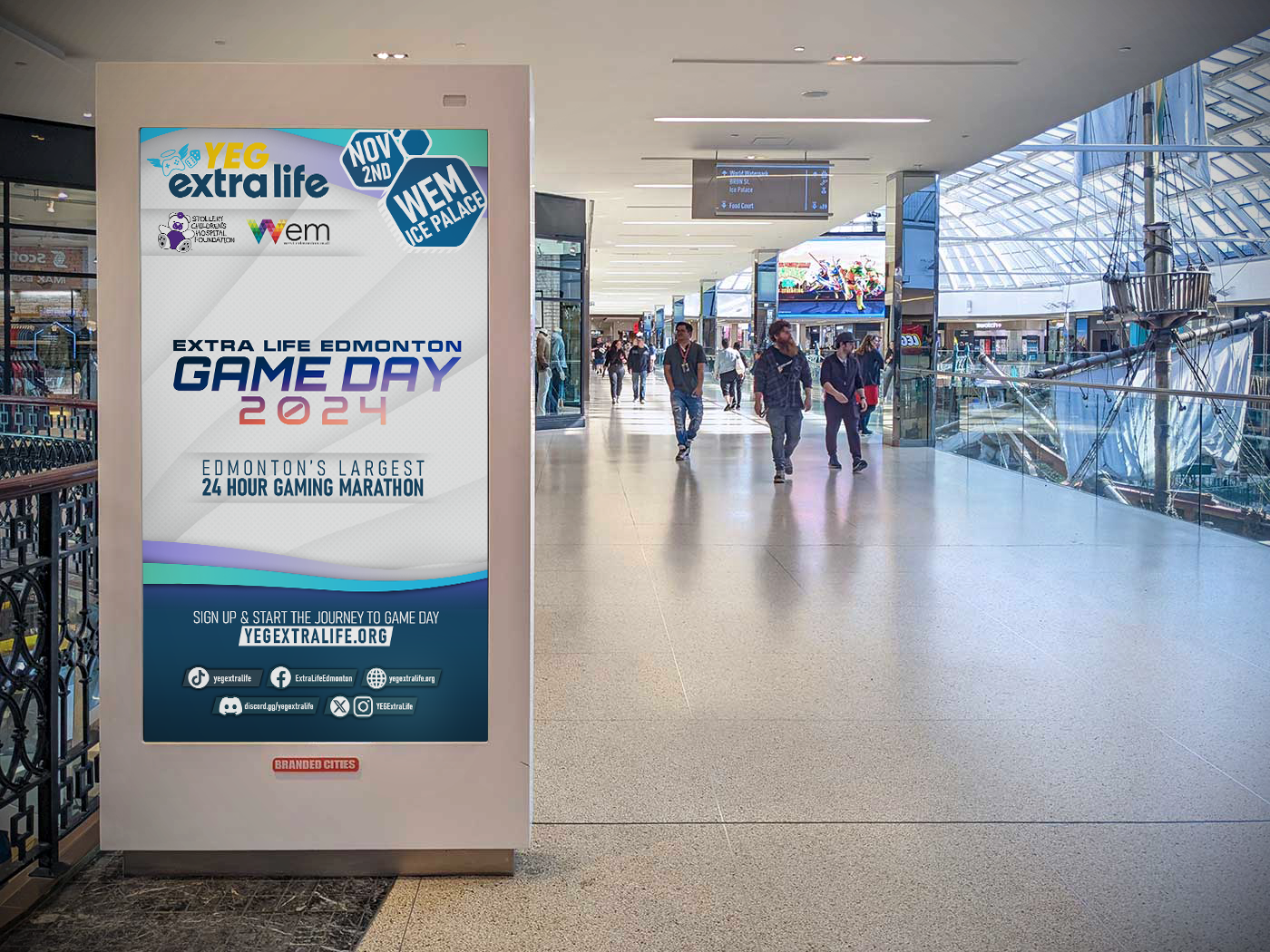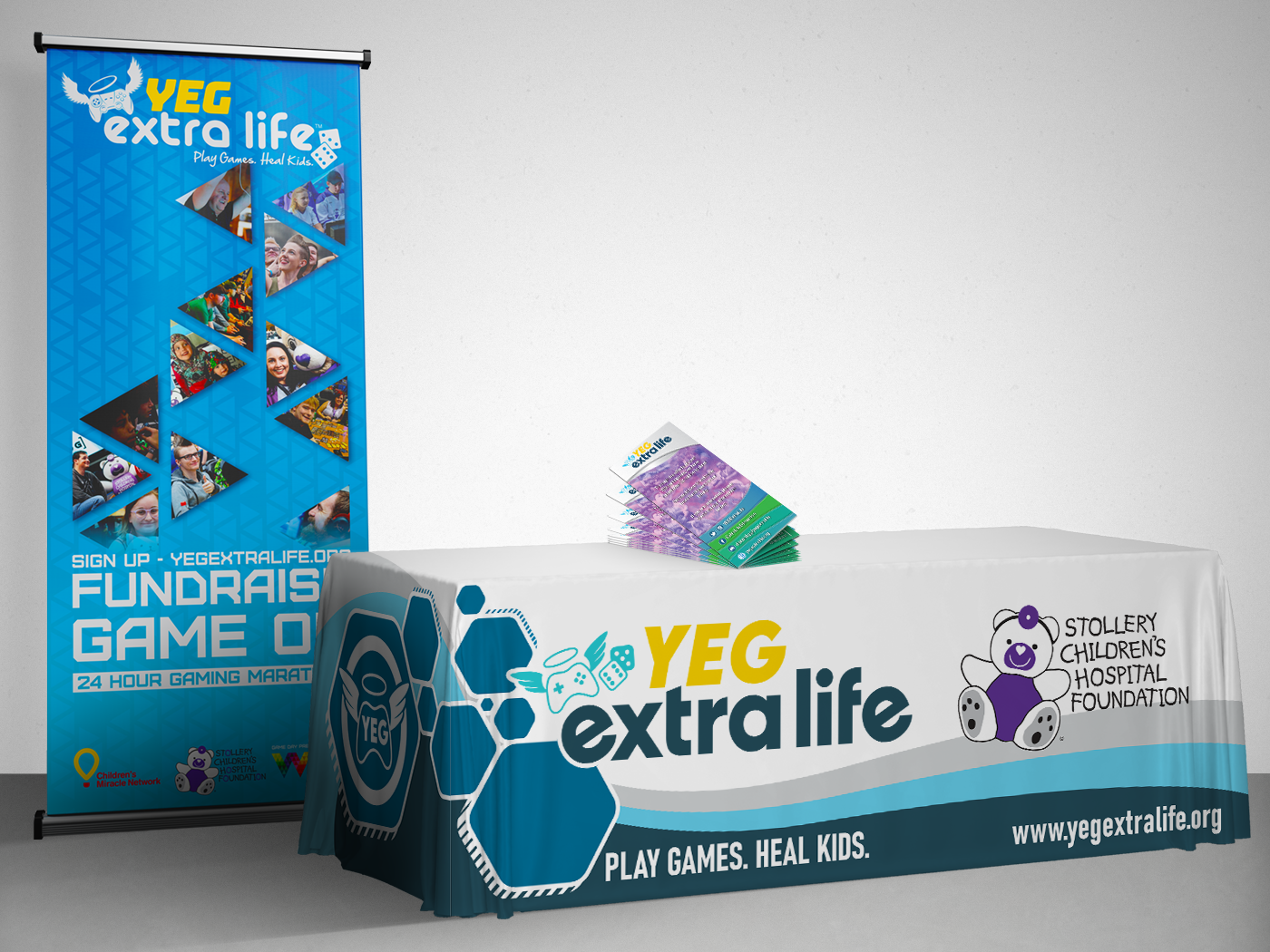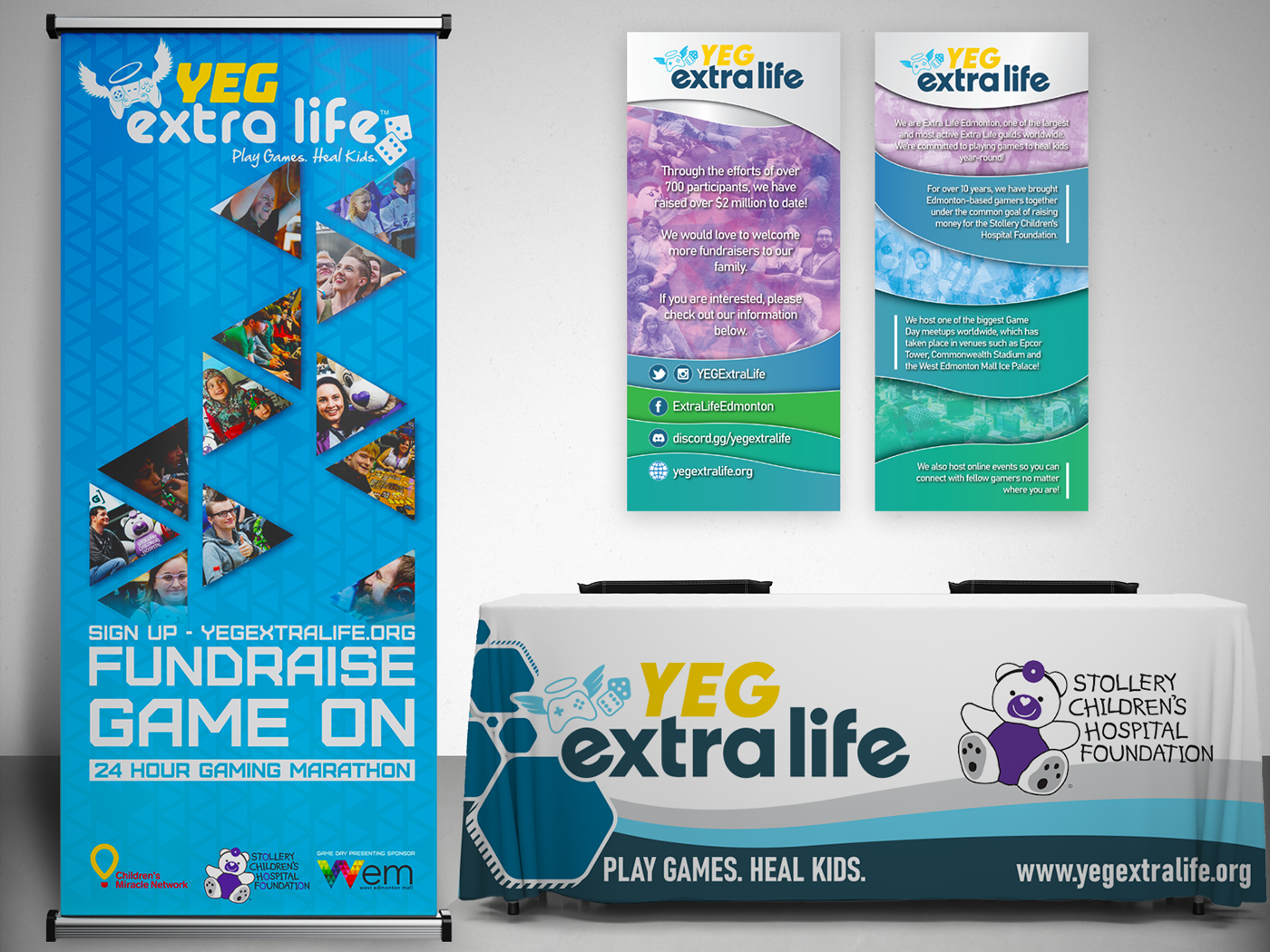 Over the years I’ve also developed a number of other materials including retractable banners, pamphlets, booth coverings, and digital signage. Because Extra Life Edmonton is volunteer-run, we don’t have the budget to update our printed assets as often as our digital ones – this can result in reusing assets over longer periods, but I do my best to ensure everything looks as cohesive as possible.